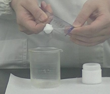 A ビーカーの上に食塩の入った容器を持っていき、計量スプーンで食塩を山盛りになるように取ります。この時、スプーンに詰め込んではいけません。