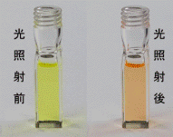 ところが、外部から薬品を加えなくても、色が変わることが世の中にはあるのです。当研究室では、外部刺激として「光」を用いています。