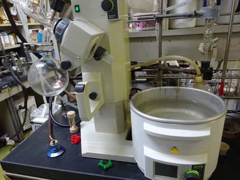 有機溶媒を減圧下で取り除く装置です。研究室内で一番上等なものを載せていますが、型式が古い装置でも冷却装置はしっかりとつけているので、溶媒の回収はバッチリです。排気ラインも種田が組んでいますので、有機溶媒は外に漏らしません!ちなみに、排気が漏れている場合、種田は髪へのダメージで気付きます。髪がキッシキシになってしまいます。