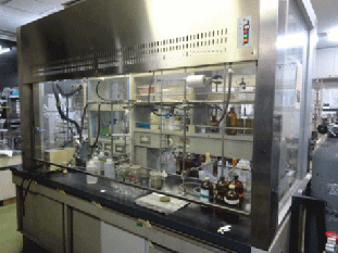新しい有機化合物を合成するとなると、有機溶媒を使用することになります。この有機溶媒というものは、えてして人体に有害です。有機化学研究室では、そのような有害な物質を人体に取り込むことがないようにするために、各実験台にドラフトチャンバー(局所排気装置)が設置されています。これで安心して実験ができますね♪