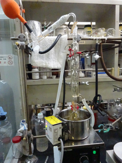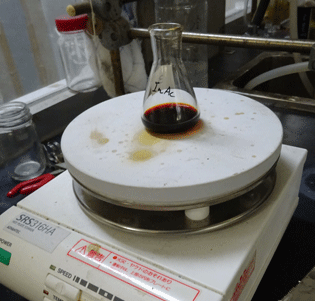 ホットマグネチックスターラーで加熱して反応を行っています。このように、溶媒を多少加熱濃縮してもドラフトチャンバー内なので大丈夫です。